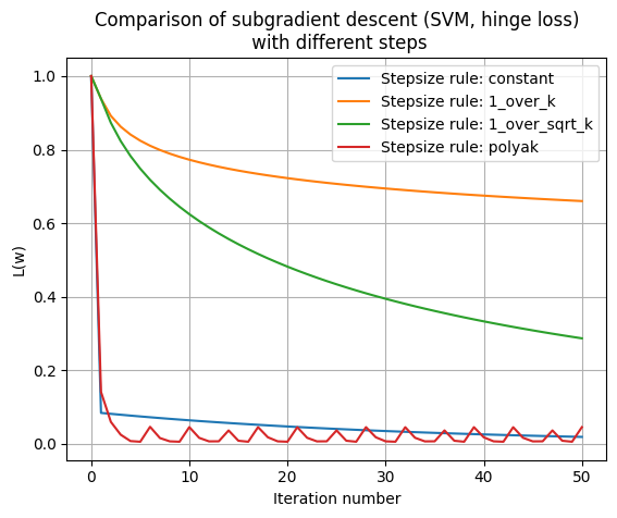 plt.title("Comparison of subgradient descent (SVM, hinge loss)\n with different steps")